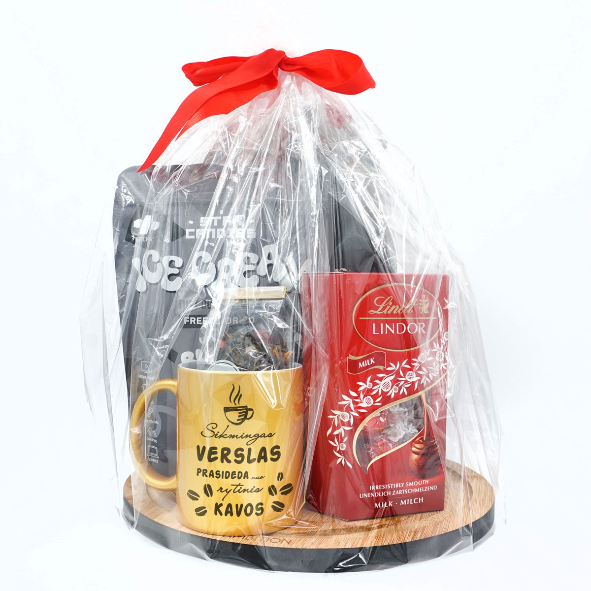 Dovanų rinkinį galima supakuoti kaip dovaną, pakavimo priemonės (juostelė ir dovanų pakavimo popierius) pridedamos.