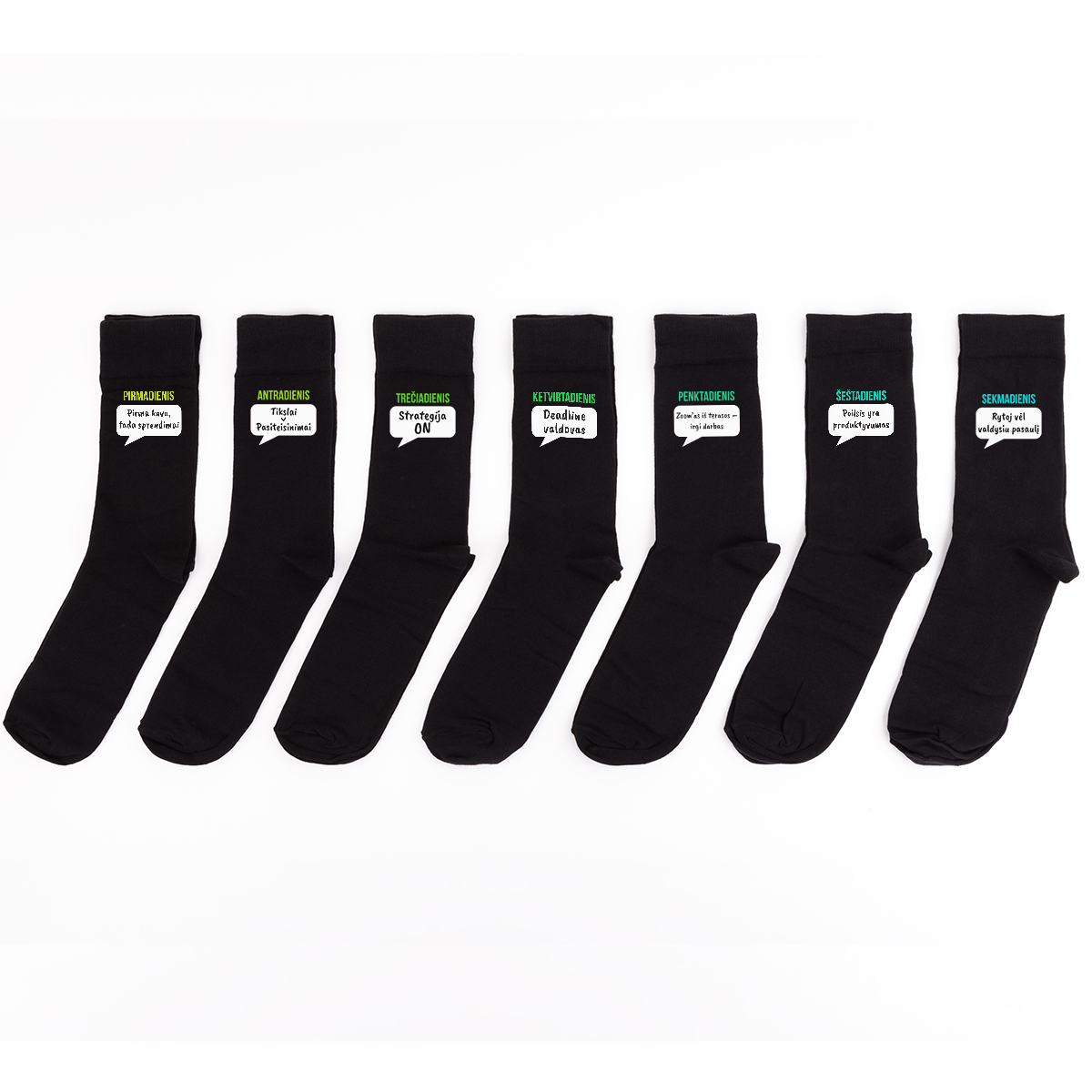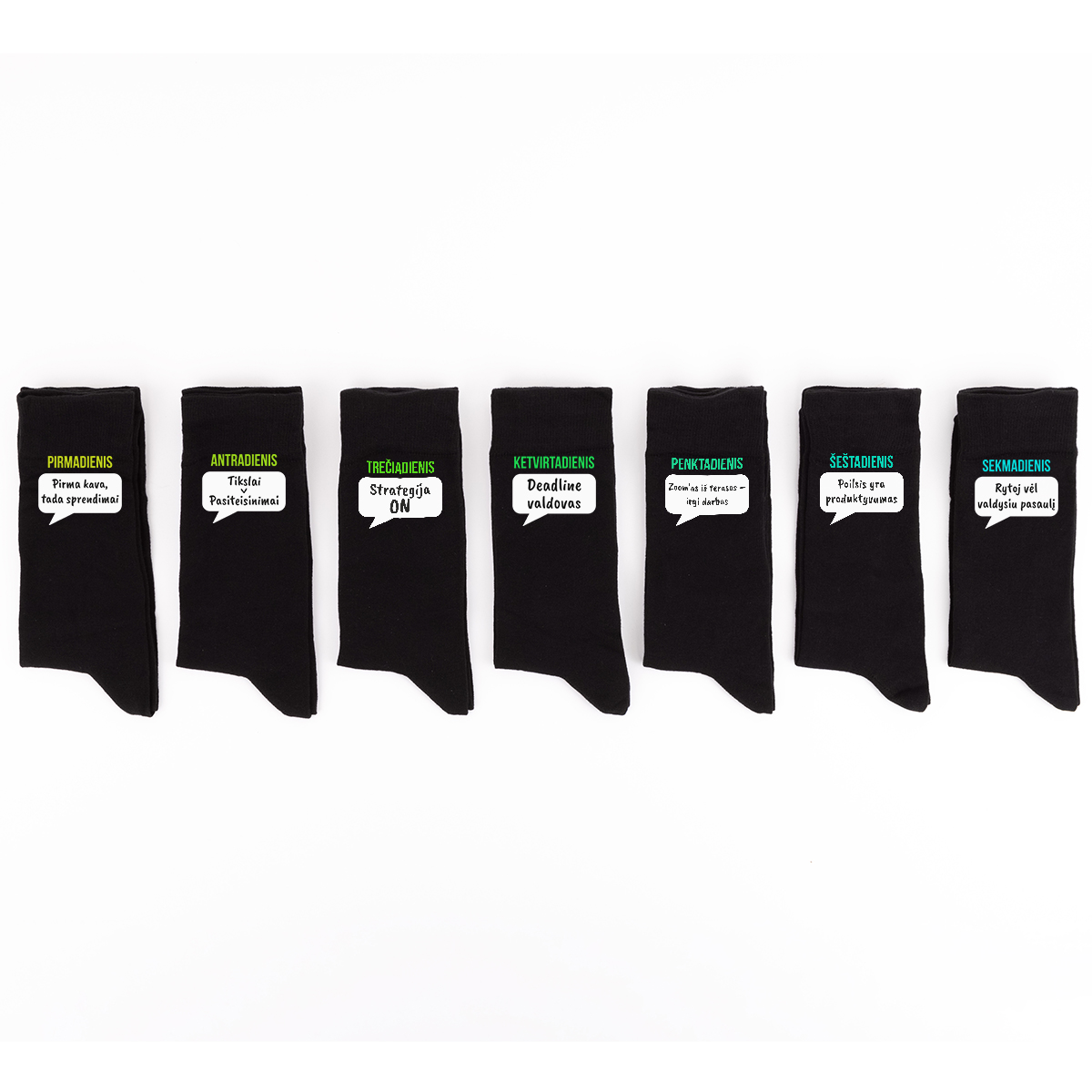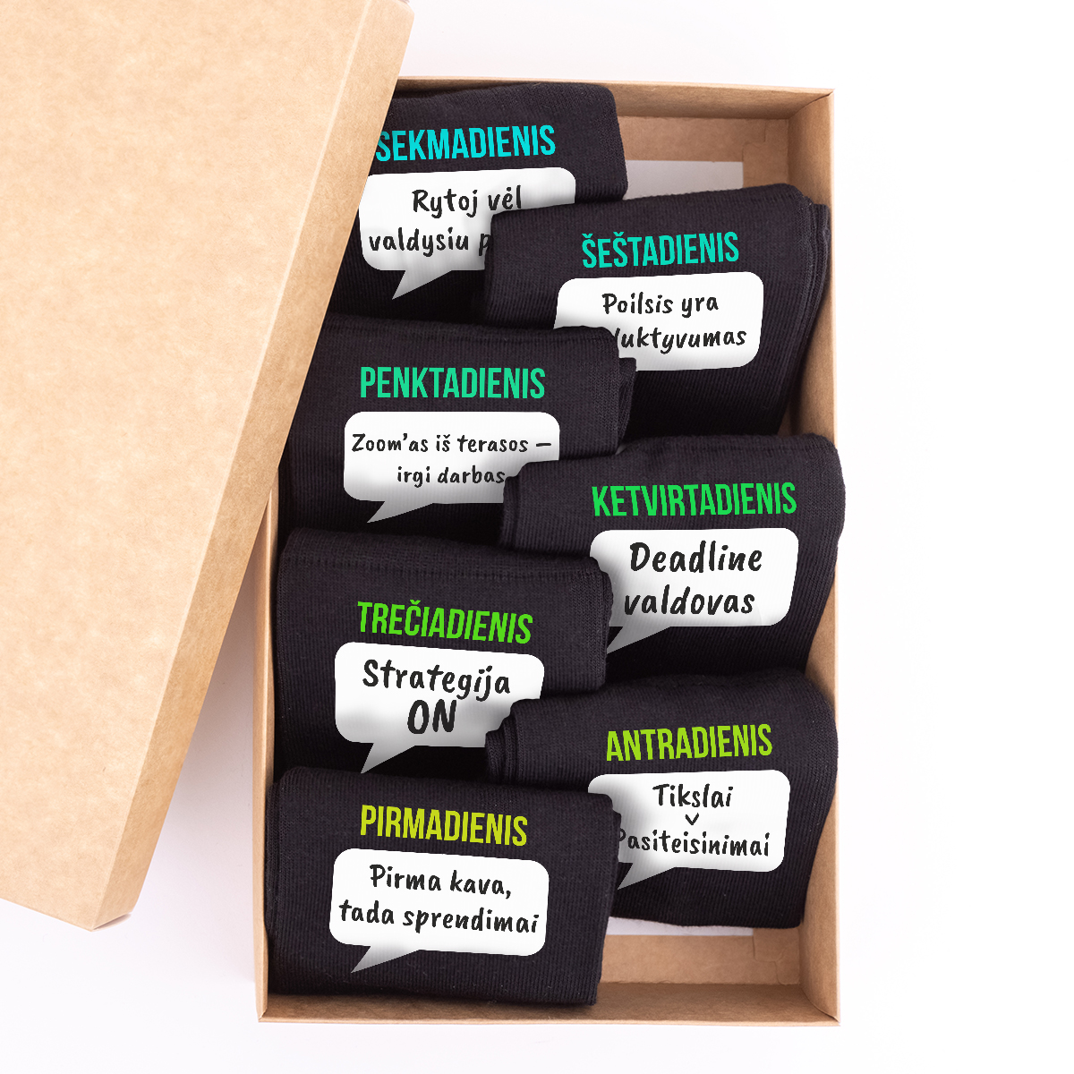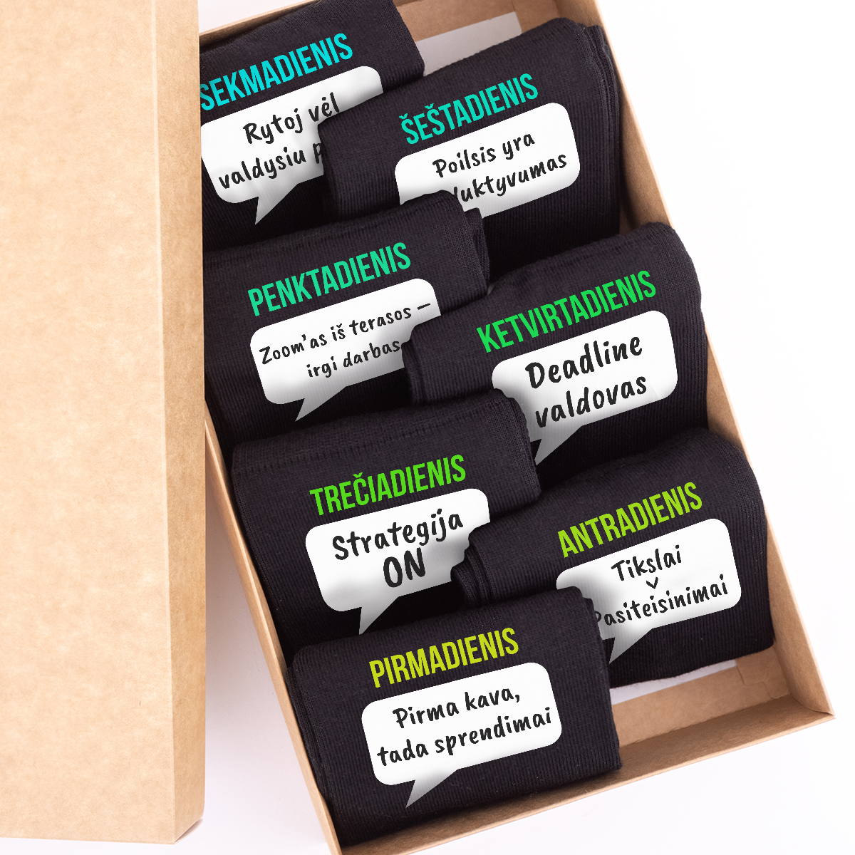- 7 poros kojinių su spauda ant kiekvienos kojinės (7 skirtingi maketai x 2 vnt.).