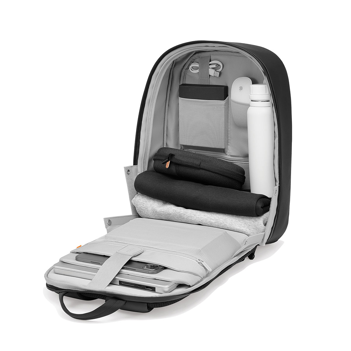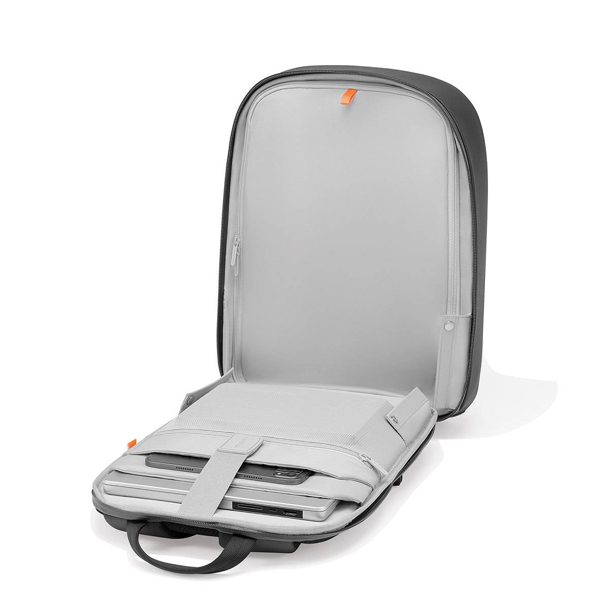 Pagrindinis skyrius pritaikytas patogiam kasdienių daiktų susidėjimui, o aiškus vidinių skyrių išdėstymas leidžia viską laikyti tvarkingai ir lengvai pasiekti. Kuprinė išsiskiria integruotais apsaugos sprendimais, todėl puikiai tinka tiek miestui, tiek kelionėms.