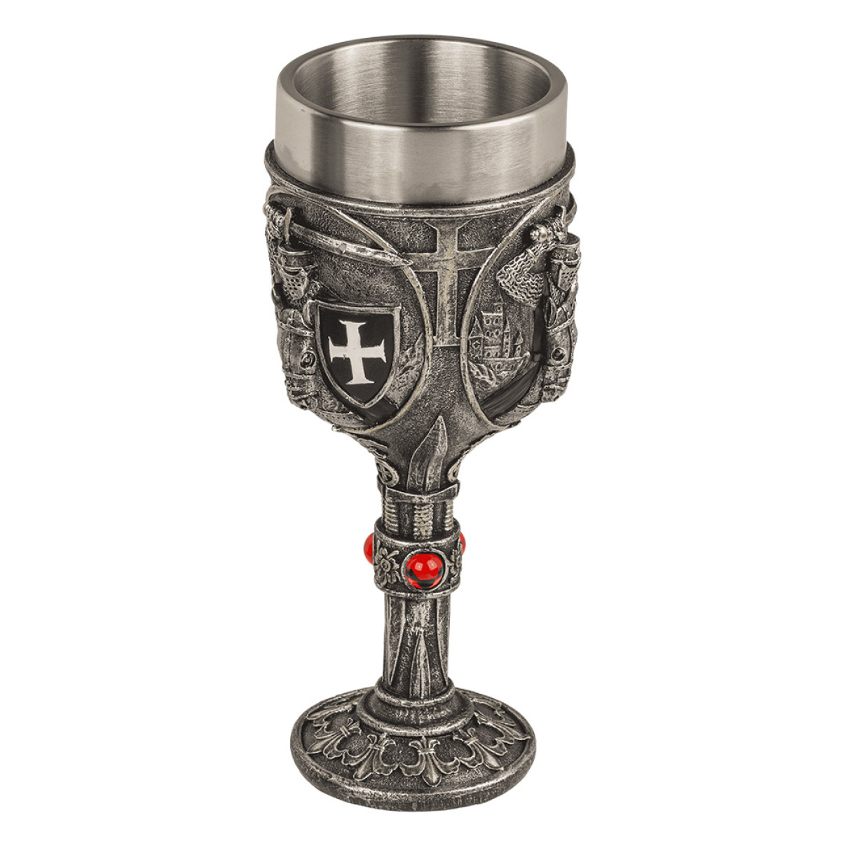 Išskirtinio dizaino riterio stiliaus taurė su nerūdijančio plieno įdėklu – puikus derinys tarp funkcionalumo ir dekoratyvumo. Pagaminta iš polirezino (polyresin) su kruopščiai išdirbtomis detalėmis, primenančiomis šarvus ir viduramžių dvasią. Tvirta, patogi laikyti ir puikiai tinka tiek kasdieniam naudojimui, tiek kaip kolekcinė ar dovaninė taurė.